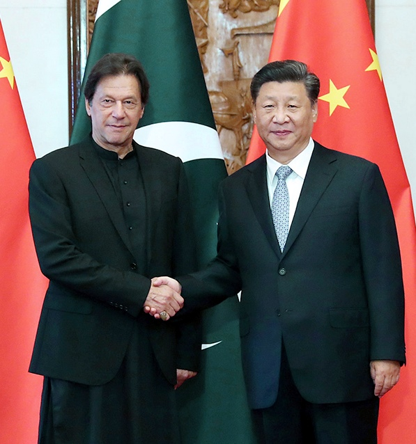 习近平指出,今年是新中国成立70周年。我们举行了一系列盛大庆典,这也是一次爱国主义的集中教育。近14亿中国人民人心空前凝聚,爱国热情空前高涨,更坚定了我们排除一切艰难险阻走中国特色社会主义道路、把自己的事情办好、立足世界民族之林的信心和决心。巴基斯坦朋友曾在中国困难的时候提供了无私帮助,现在中国发展起来了,真诚希望帮助巴方更好发展。双方要保持密切高层往来和更紧密的战略沟通,及时就重大问题协调立场。要高标准推进中巴经济走廊建设,建设好、运营好现有能源、交通基础设施、产业园区和民生项目,把走廊打造成高质量共建“一带一路”的示范工程。中方高度赞赏并坚定支持巴方打击恐怖主义的努力。中巴双方要加强在联合国、上海合作组织等多边机制的沟通合作,共同维护地区和平稳定。