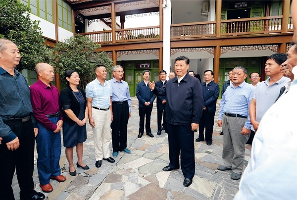 2019年9月16日至18日,中共中央总书记、国家主席、中央军委主席习近平在河南考察。这是16日下午,习近平在位于信阳市新县的鄂豫皖苏区首府革命博物馆,同当地红军后代、革命烈士家属代表亲切交谈。 新华社记者 鞠鹏/摄
