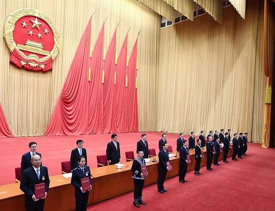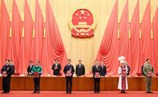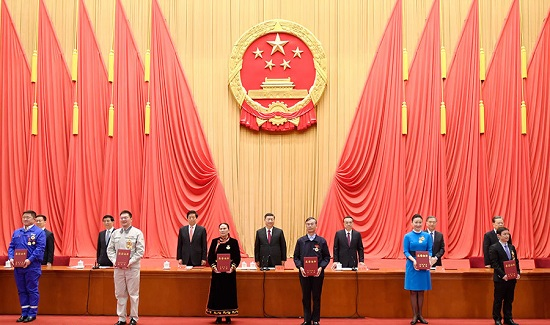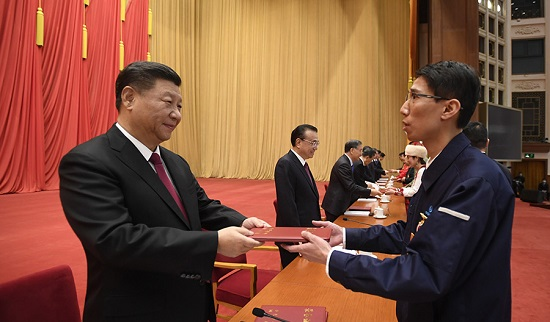 在欢快的乐曲声中,全国劳动模范和先进工作者代表依次登上主席台,习近平等为他们颁发荣誉证书。
